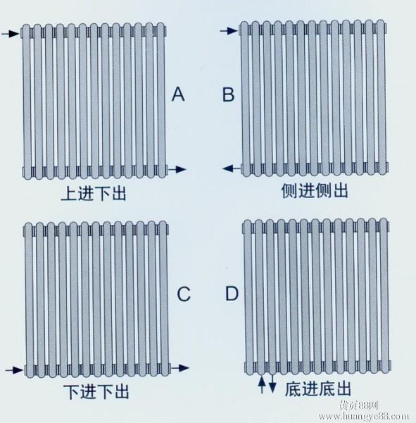 給大家介紹暖氣片的四種進出水方式分別為:異側上進下出、同側上進下出、下進下出、底進底出。